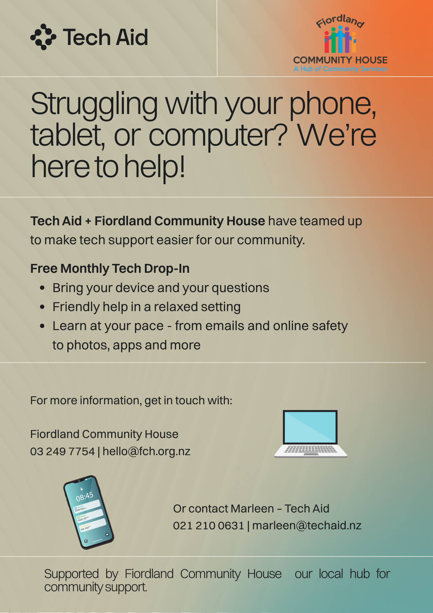 During these sessions, I’m based at one of the Fiordland Community House office and sit down one-on-one with you to help with whatever you need at your pace.